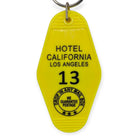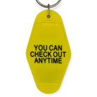 - Pendentif jaune "You Can Check Out Anytime" : une touche d’humour et d’ironie.