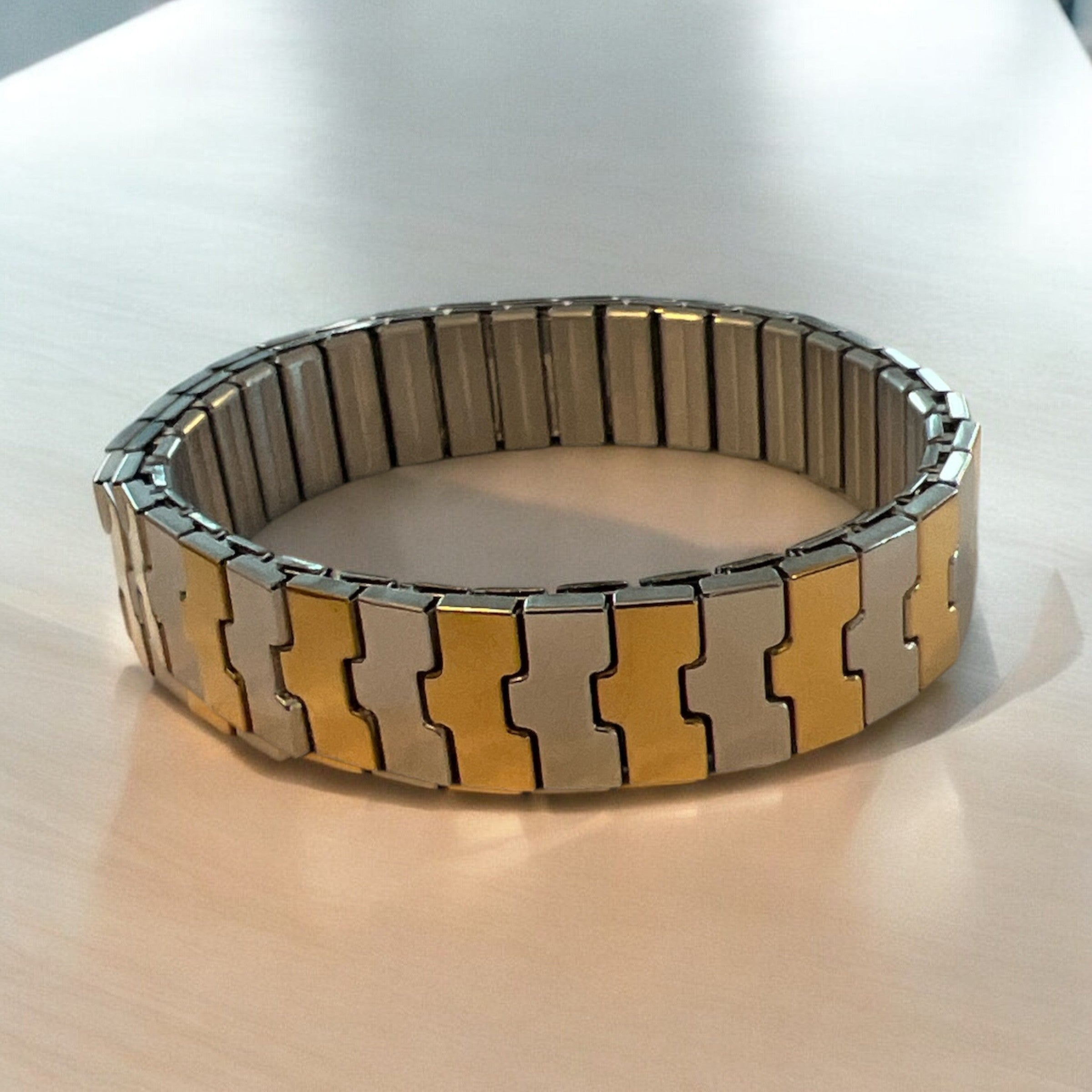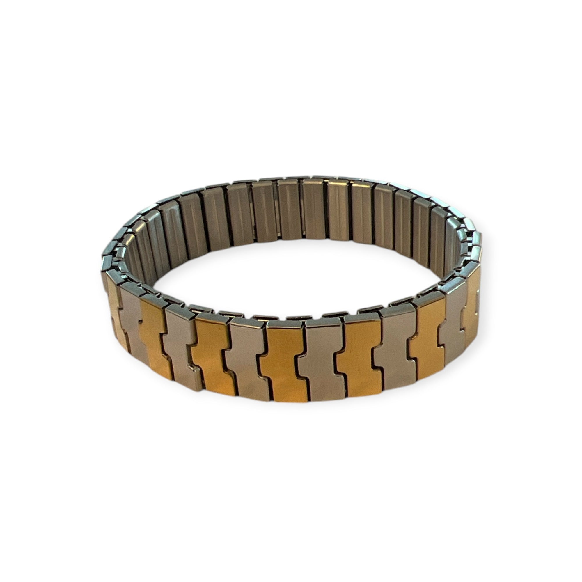 Ce bracelet extensible argenté et doré est une pièce unique au design texturé. Les maillons alternent entre une finition argentée lisse et des plaques dorées martelées, ajoutant du relief et de l’éclat à votre poignet. Élégant et confortable grâce à son système extensible, il s'adapte parfaitement à toutes les morphologies et s'enfile en un instant.