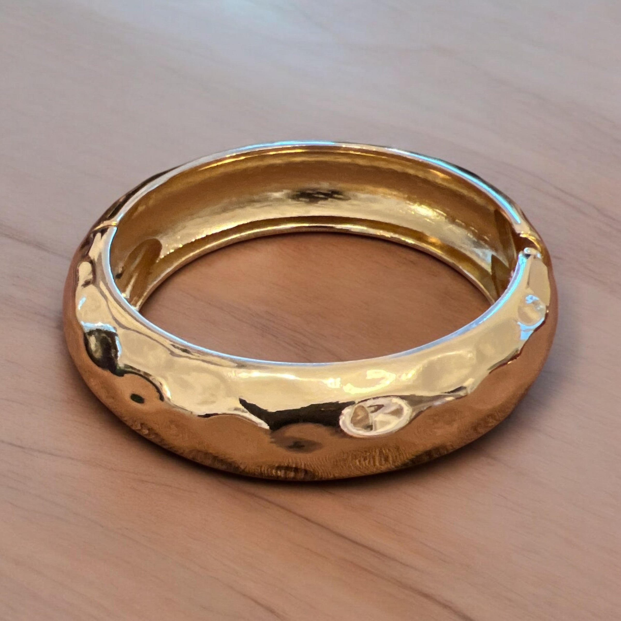 Bracelet bombé martelé en laiton doré, un bijou au charme brut et raffiné. Son design aux courbes organiques et à la texture irrégulière capte la lumière pour un effet éclatant. Chaque pièce est réalisée avec soin, pour un rendu unique qui s’inscrit dans une esthétique à la fois moderne et intemporelle.