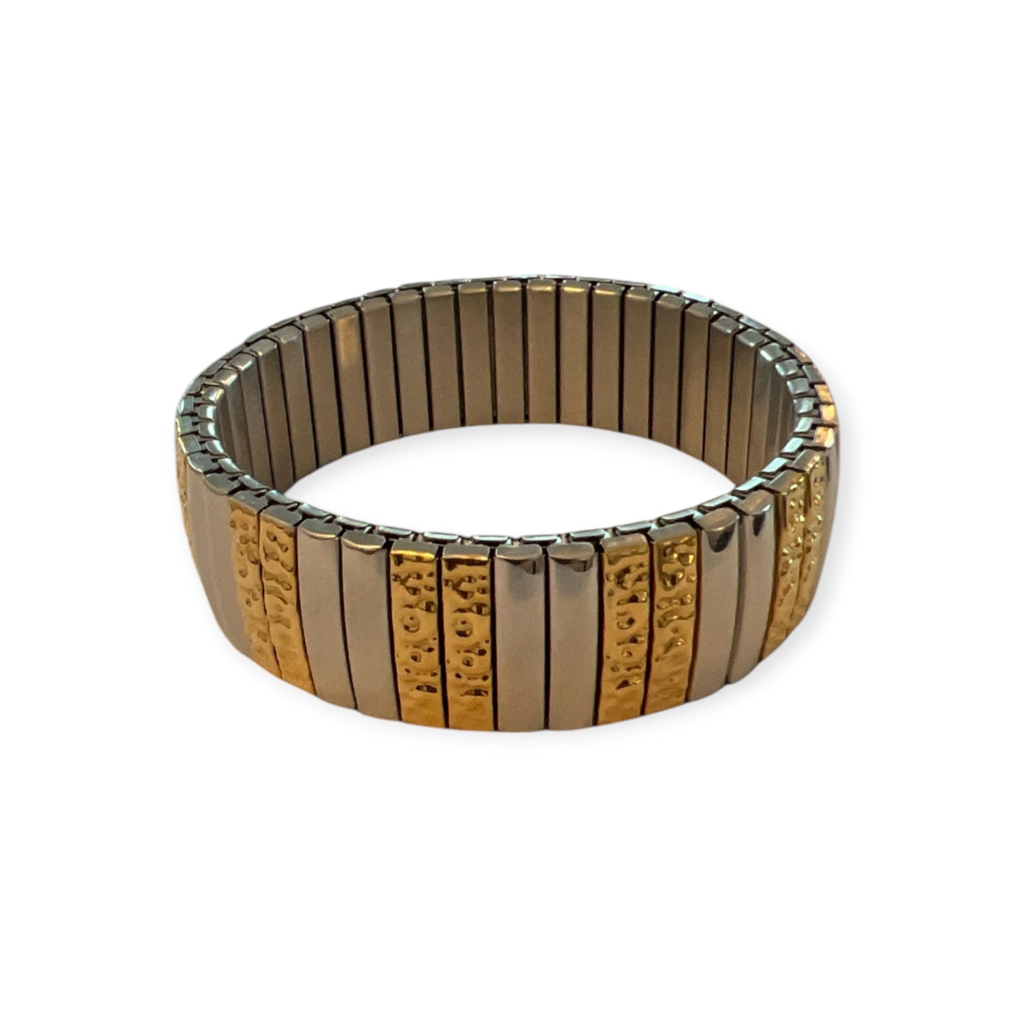 Bracelet élastique bicolore, alliant acier inoxydable argenté et touches dorées martelées. Un bijou moderne et audacieux, parfait pour rehausser votre style au quotidien. Son design graphique joue sur les contrastes entre les finitions lisses et martelées, créant une harmonie visuelle qui attire immédiatement le regard.