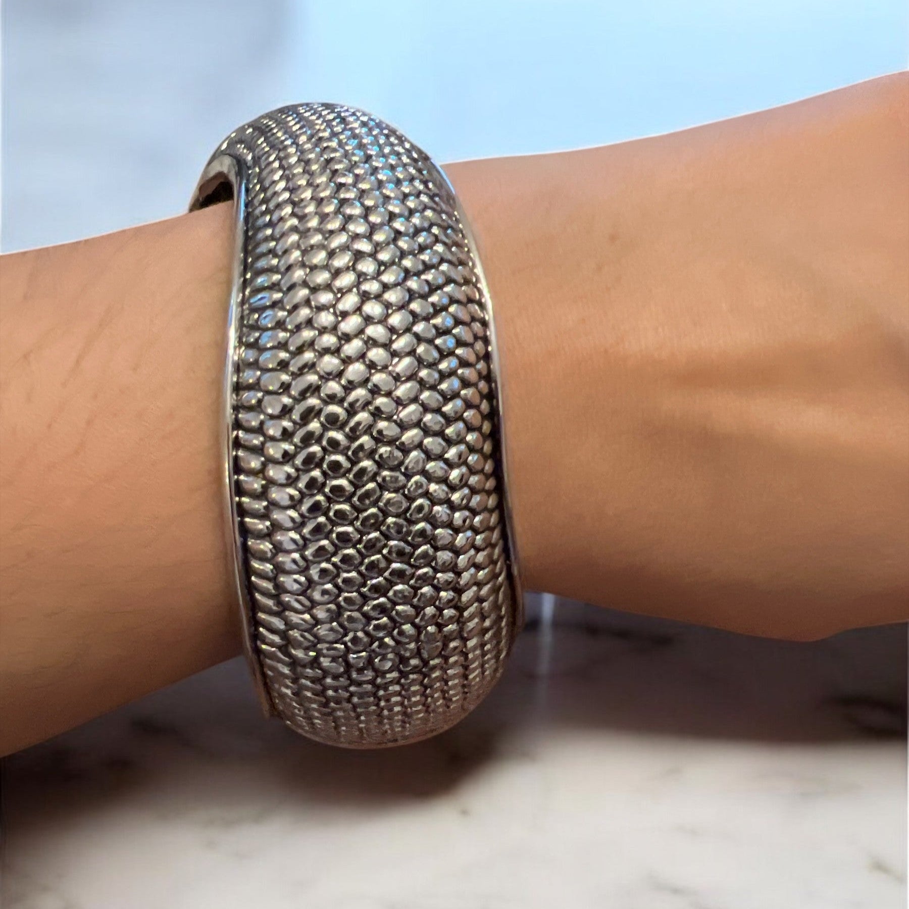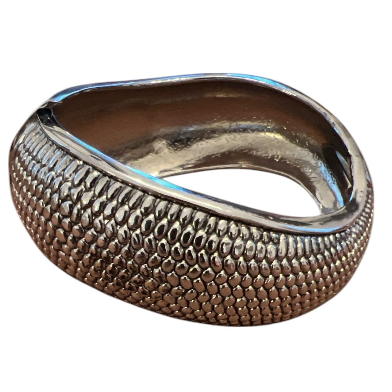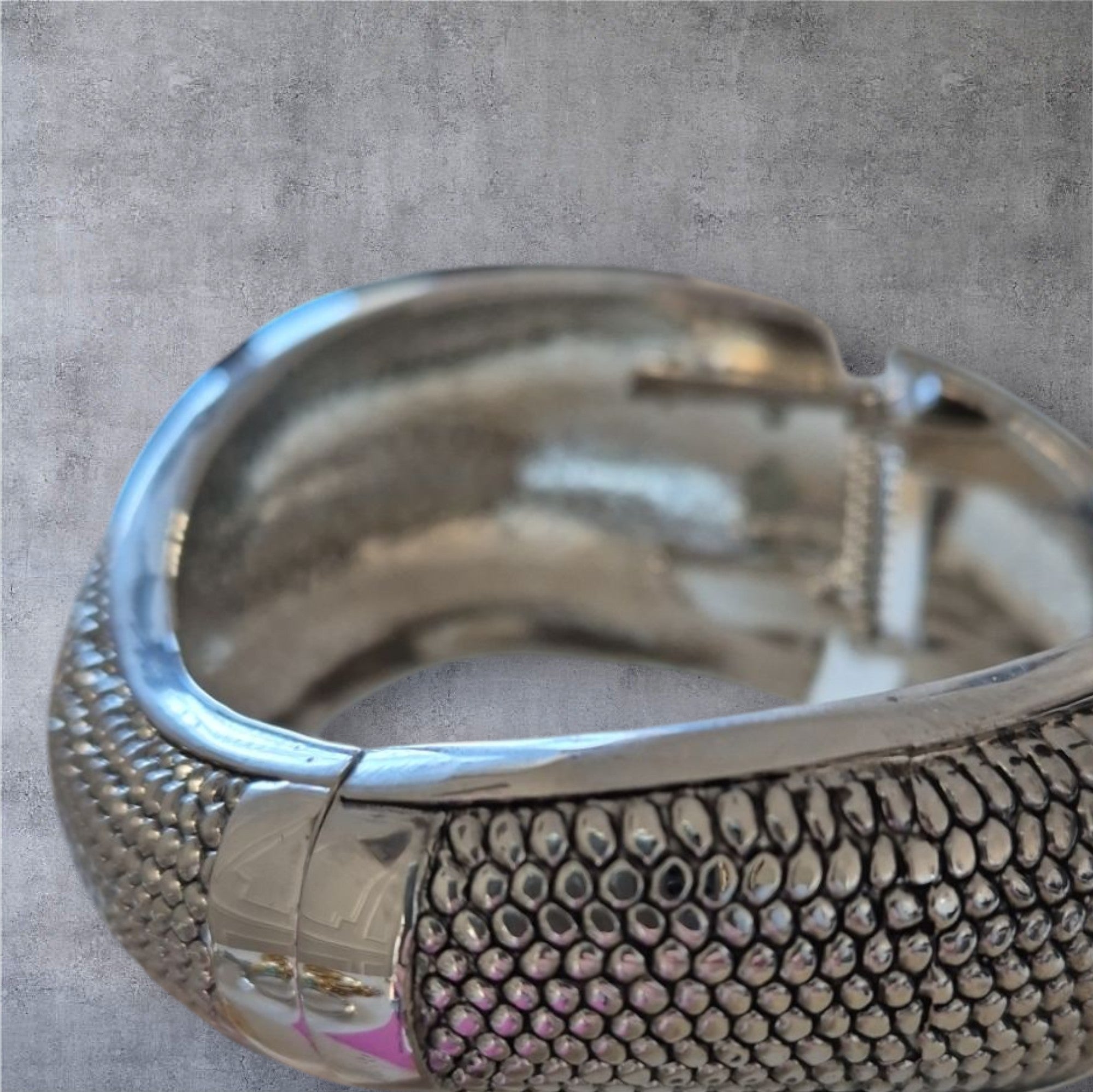 Ce bracelet en métal argenté au design texturé est une véritable pièce statement. Avec sa forme sculpturale et ses détails martelés rappelant une peau reptilienne, il est à la fois moderne et intemporel. Idéal pour celles qui recherchent un bijou original et audacieux, ce bracelet rehausse instantanément n’importe quelle tenue.