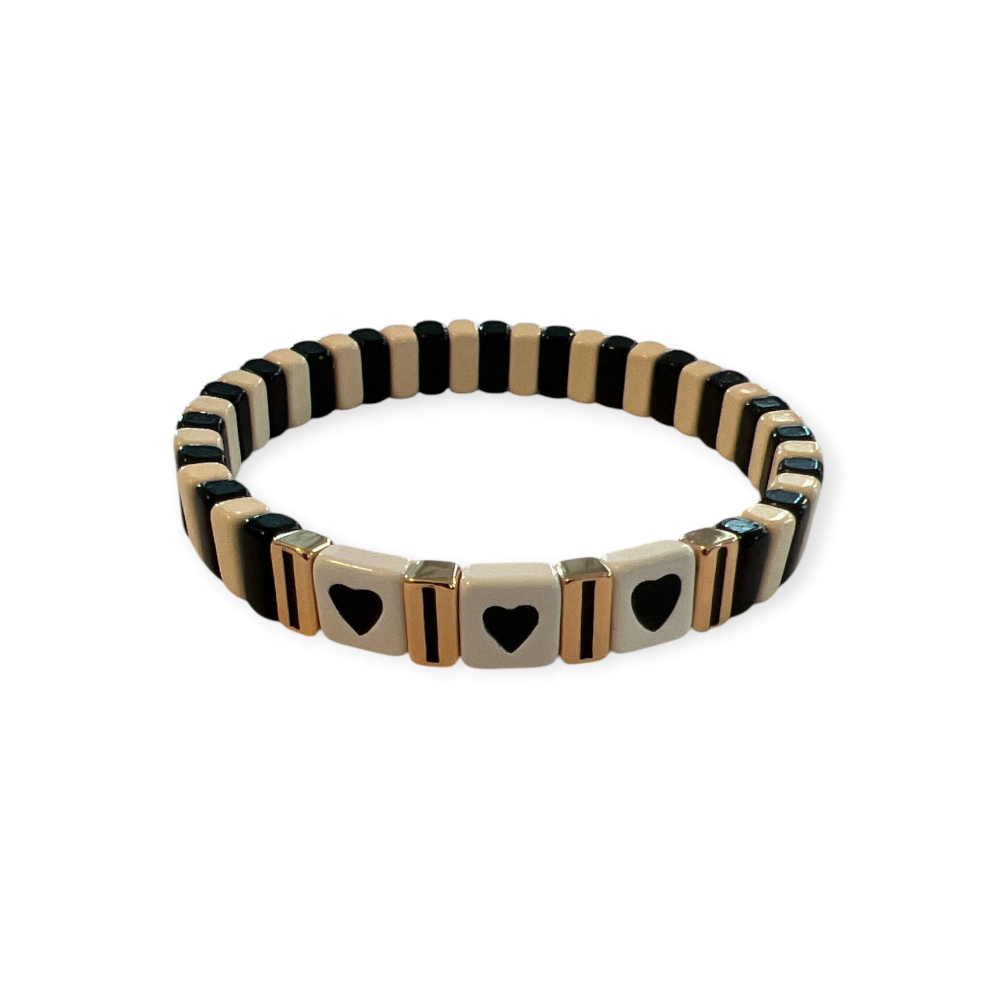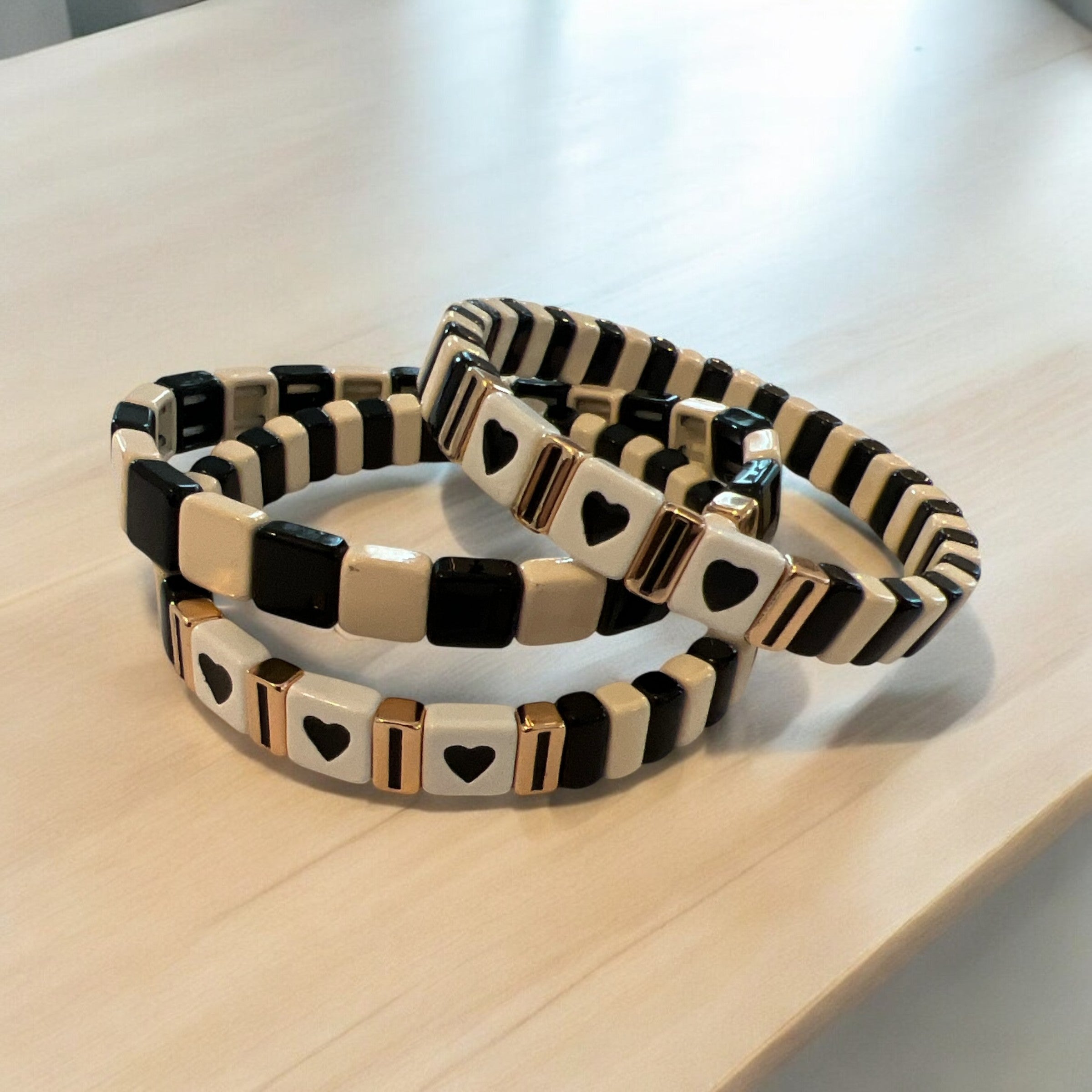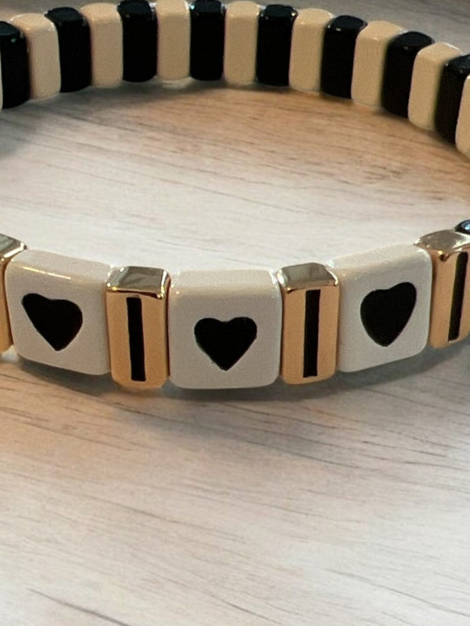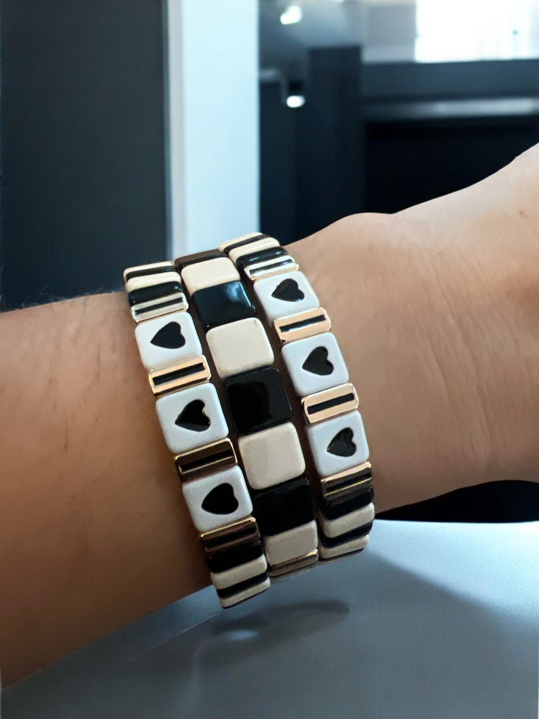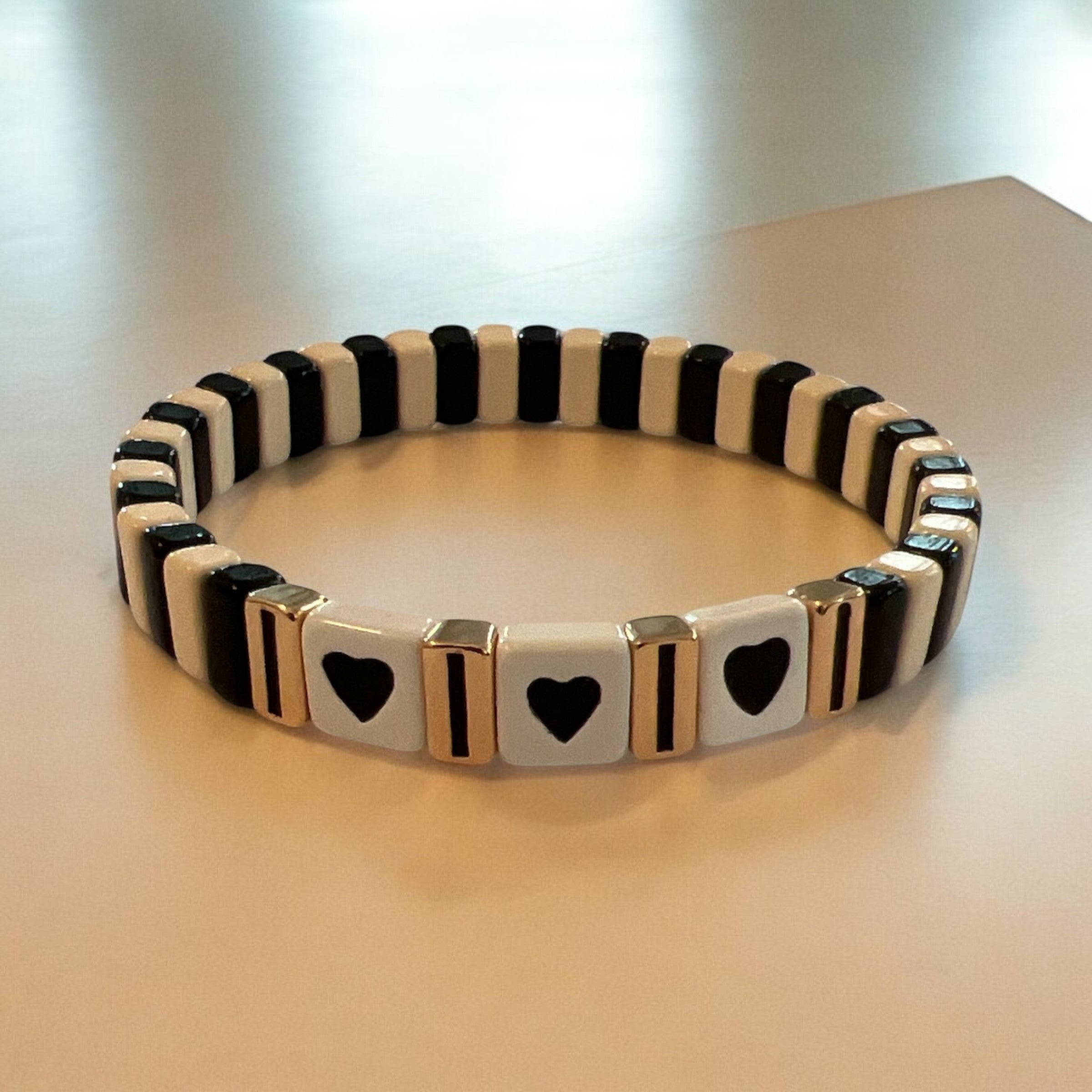 Ajoutez une touche romantique et graphique à votre look avec ce bracelet moderne. Ce modèle joue avec des éléments noirs et blancs brillants, entrecoupés de détails dorés, et orné d’une section délicate de motifs cœurs noirs sur fond blanc. Ce mélange subtil d’élégance et de douceur en fait un bijou idéal pour toutes les occasions.