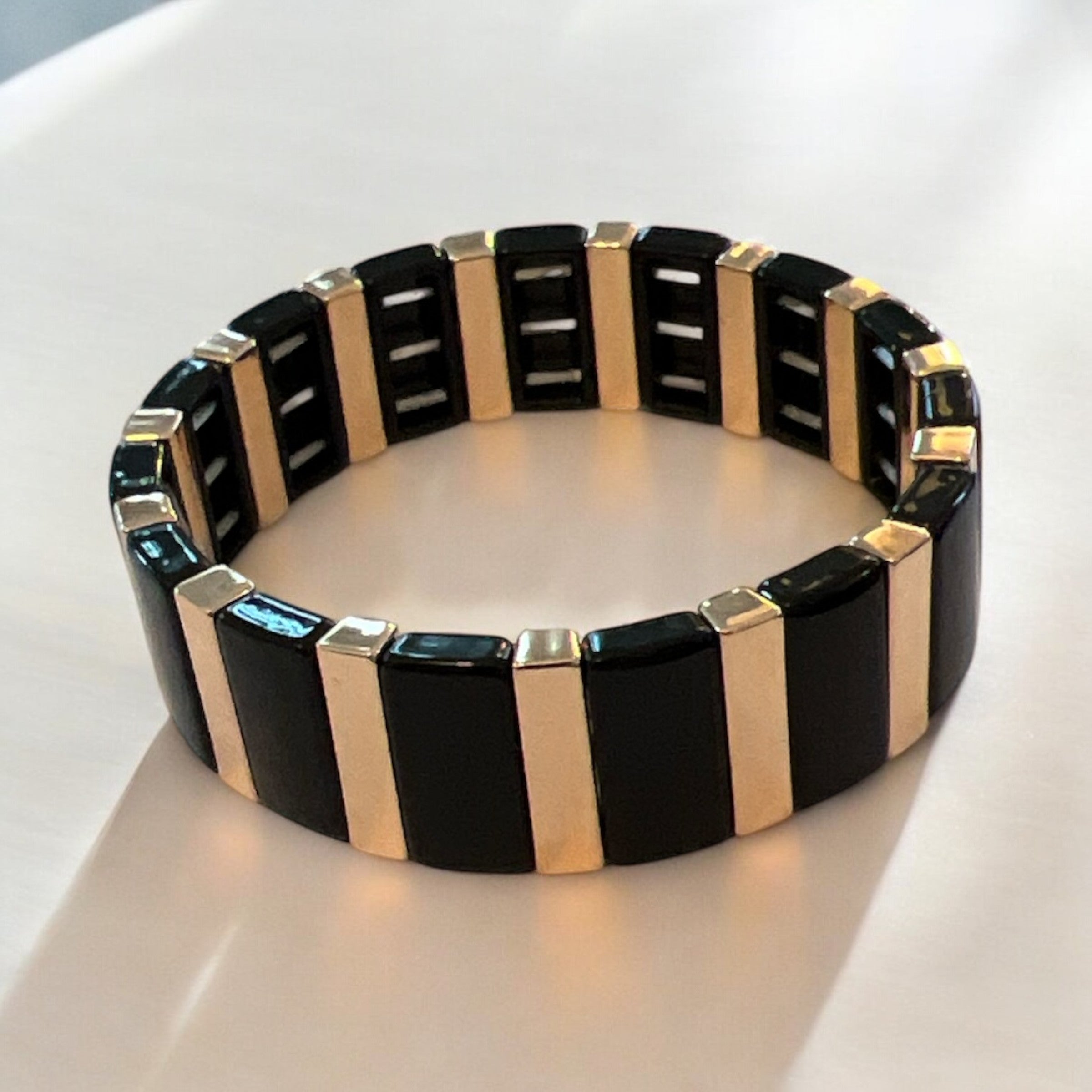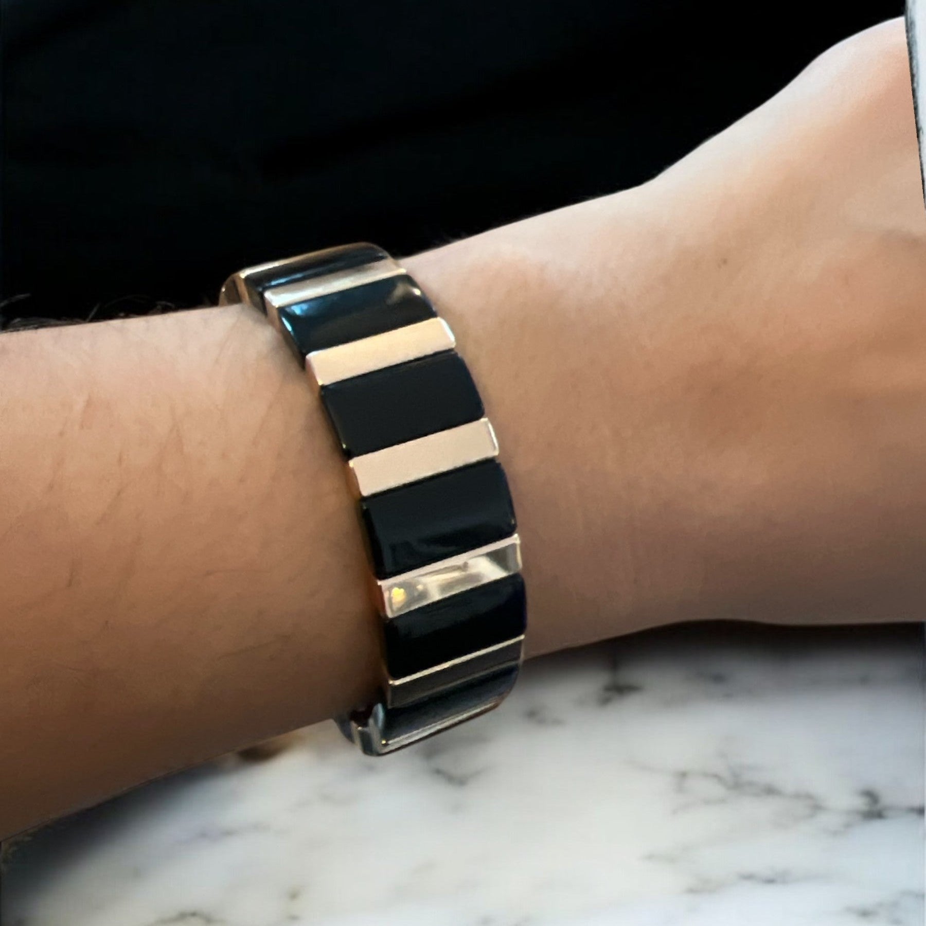 Ce bracelet élastique bicolore offre un contraste saisissant entre ses segments noirs brillants et ses éléments dorés lisses. Avec son design minimaliste et graphique, il apporte une touche d'élégance moderne à toutes vos tenues. Sa structure flexible le rend facile à enfiler, tout en garantissant un confort optimal.
