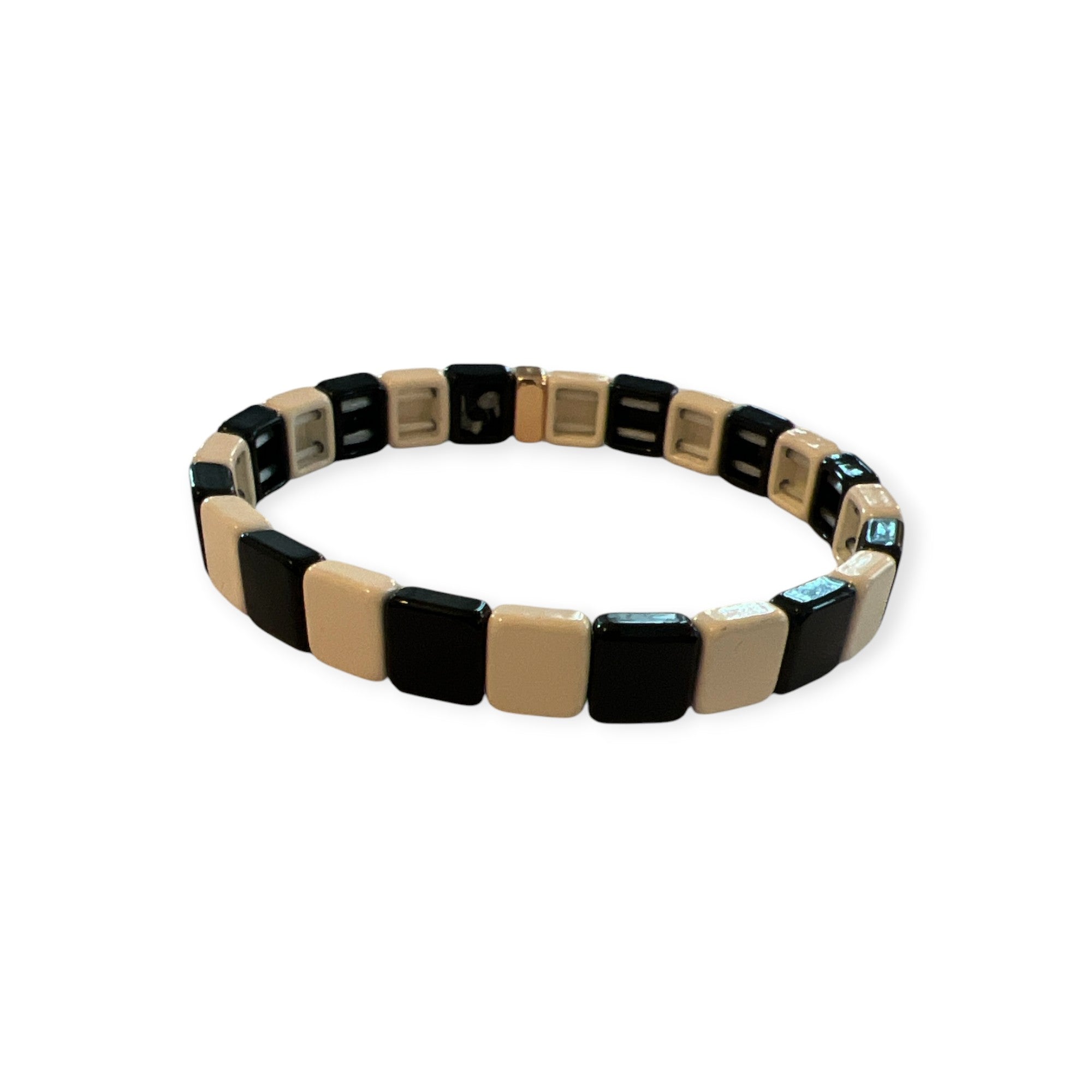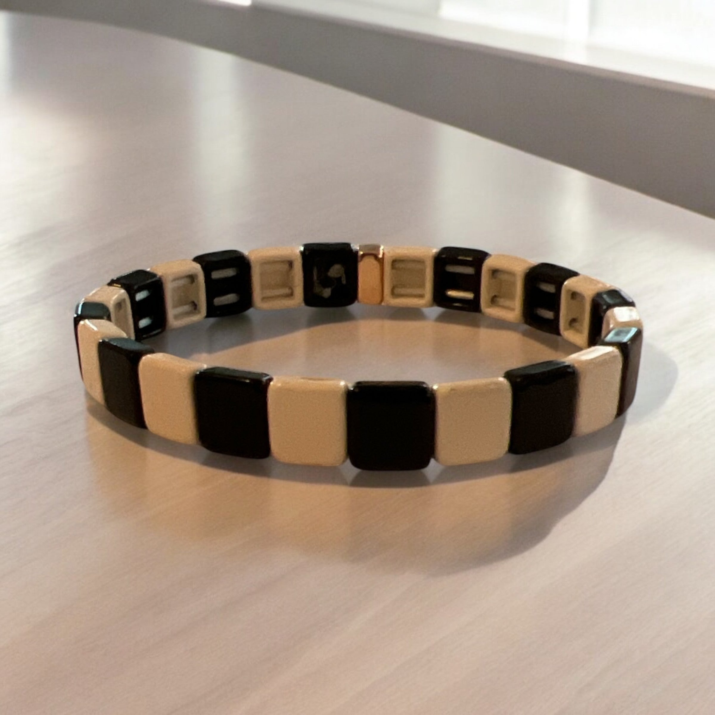 Un bracelet graphique et romantique au design moderne. Ce modèle combine des éléments noirs et blancs brillants, agrémentés de détails dorés et ornés de motifs cœurs noirs sur fond blanc. Une pièce pleine de charme, idéale pour exprimer vos émotions tout en adoptant un style chic et raffiné.