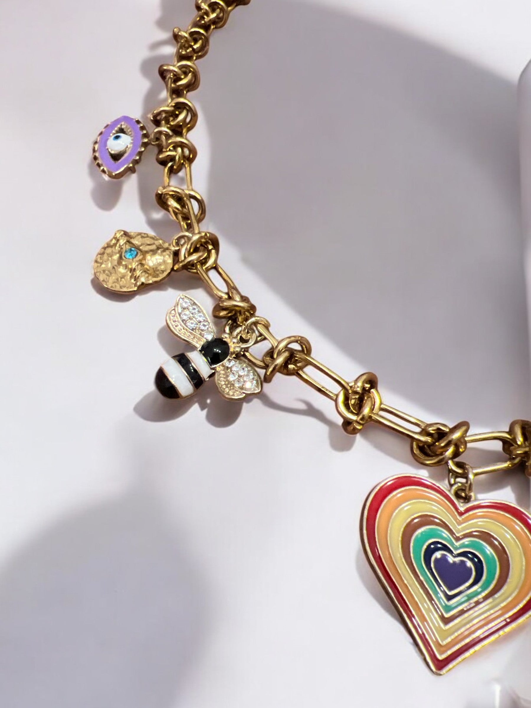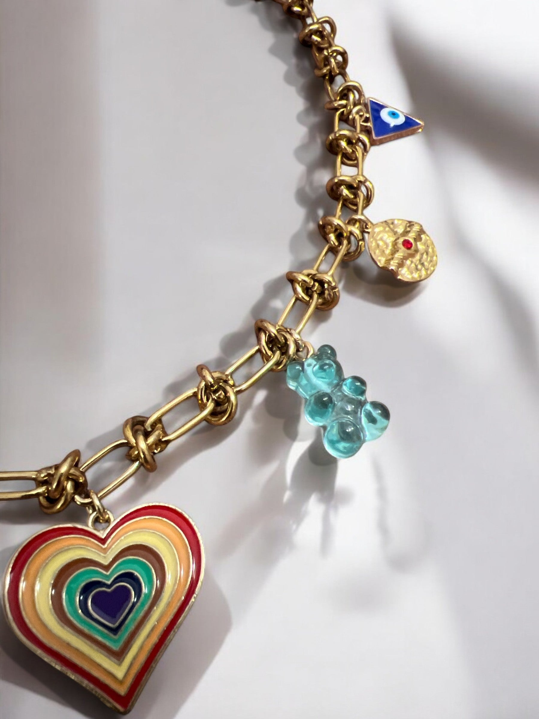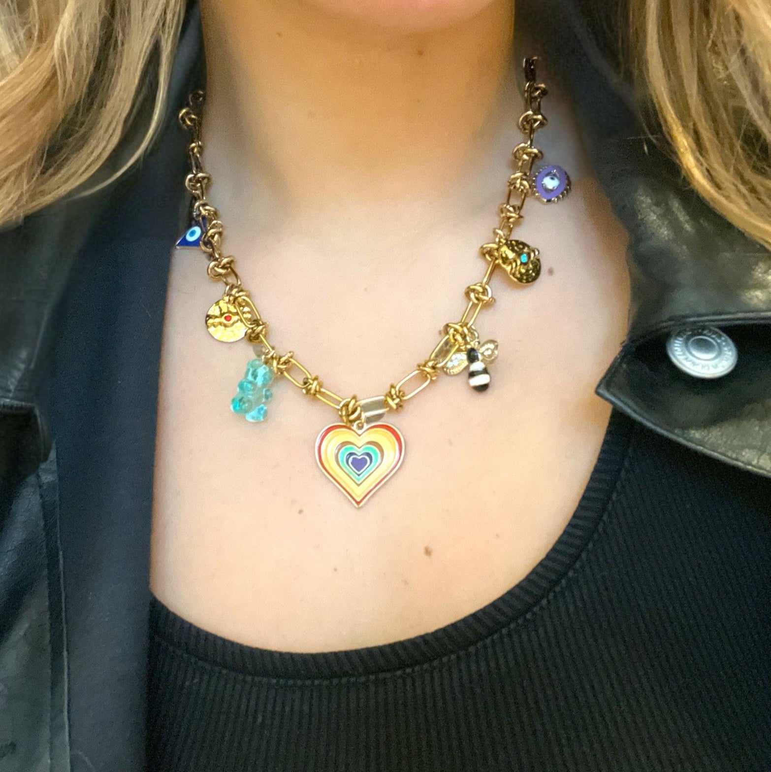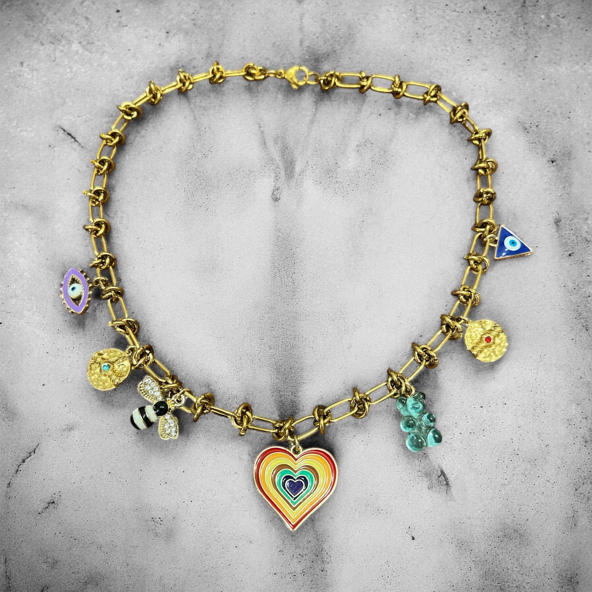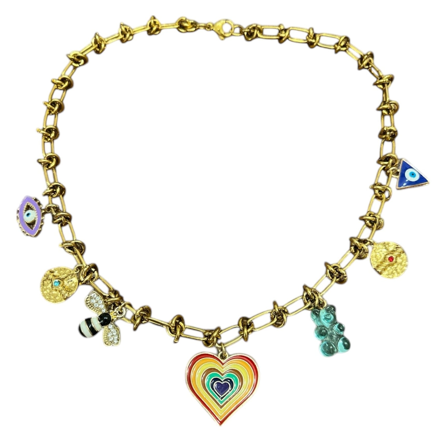 La chaîne dorée au design chic met parfaitement en valeur ces charms colorés et détaillés, pour un collier à la fois expressif et élégant.