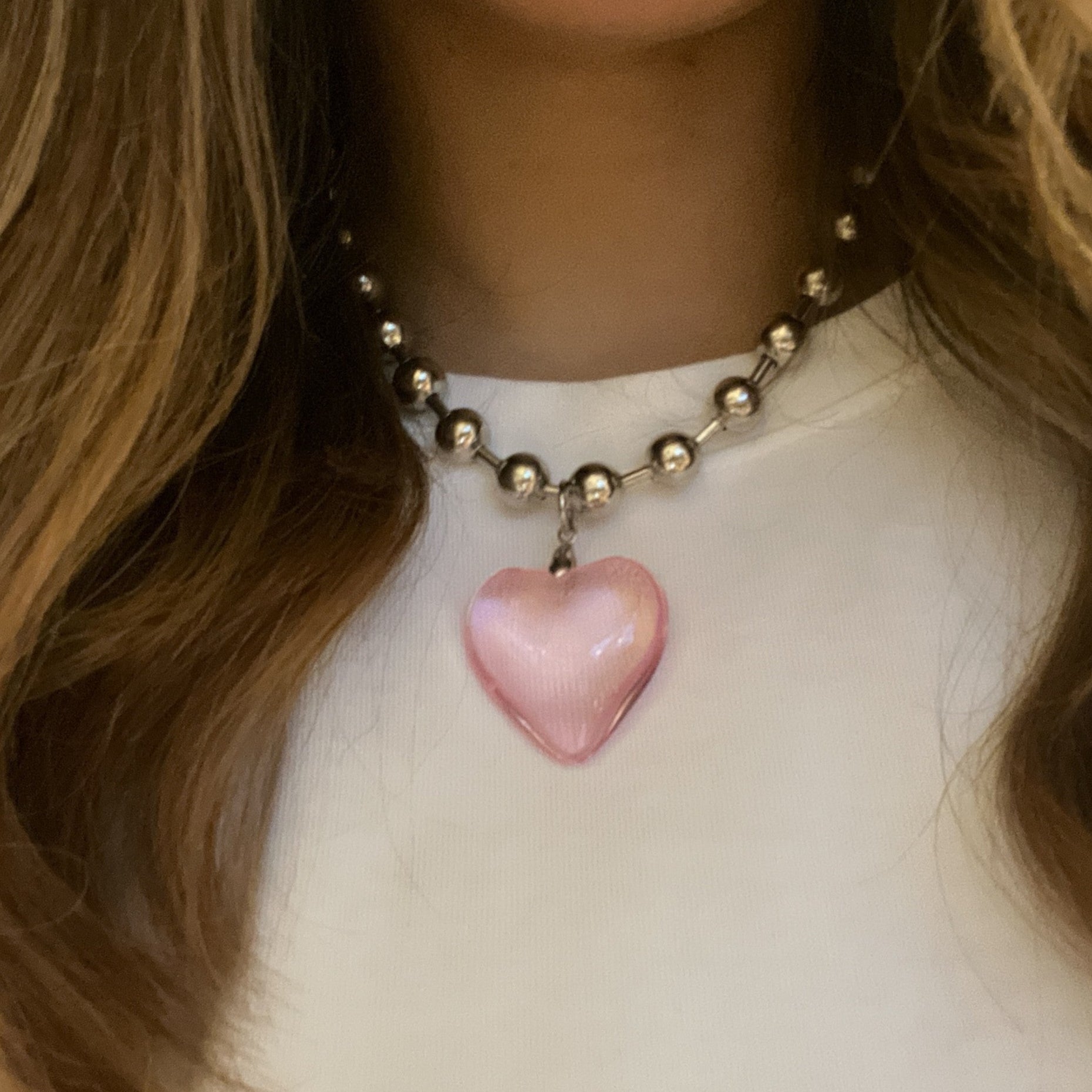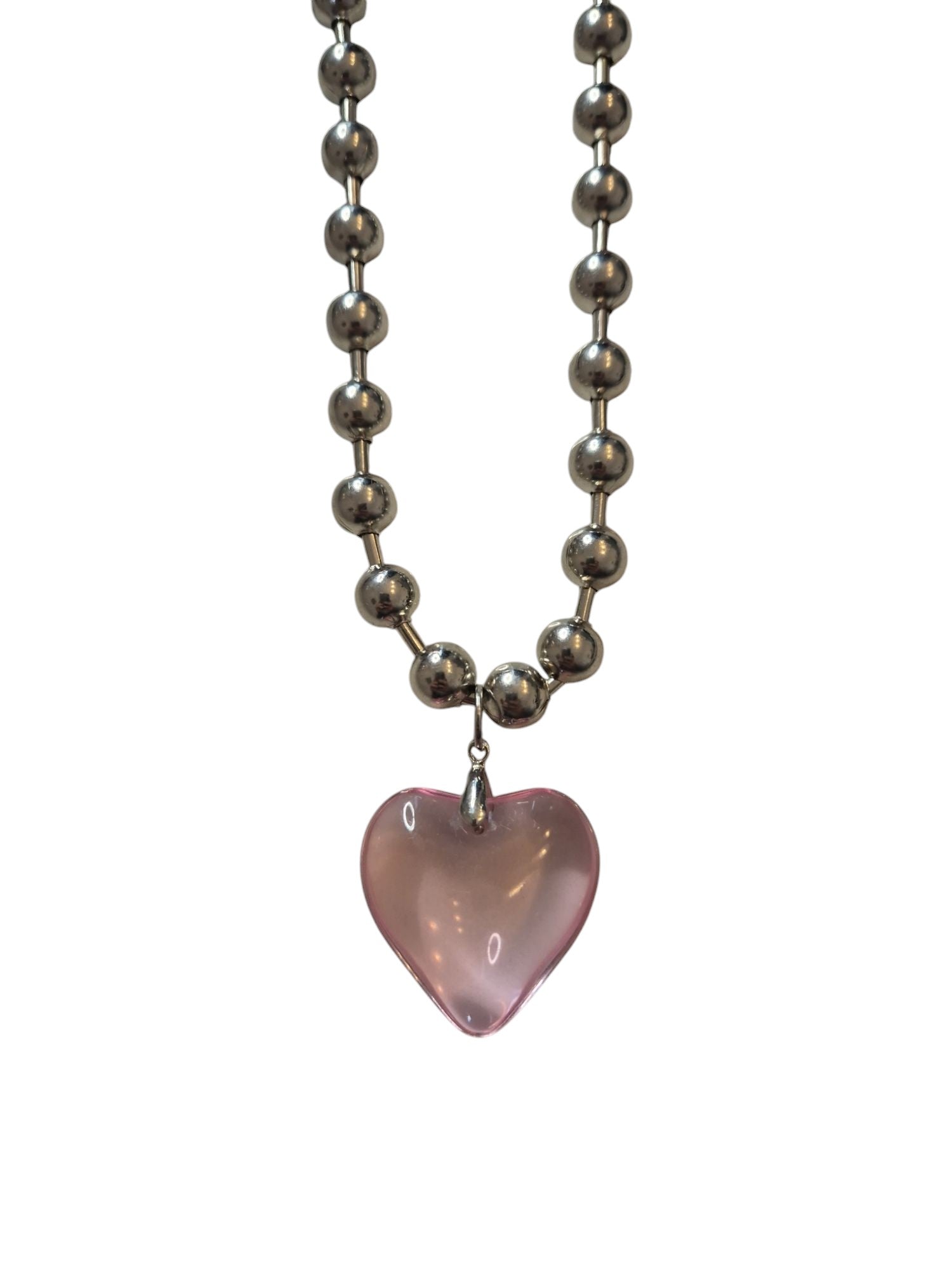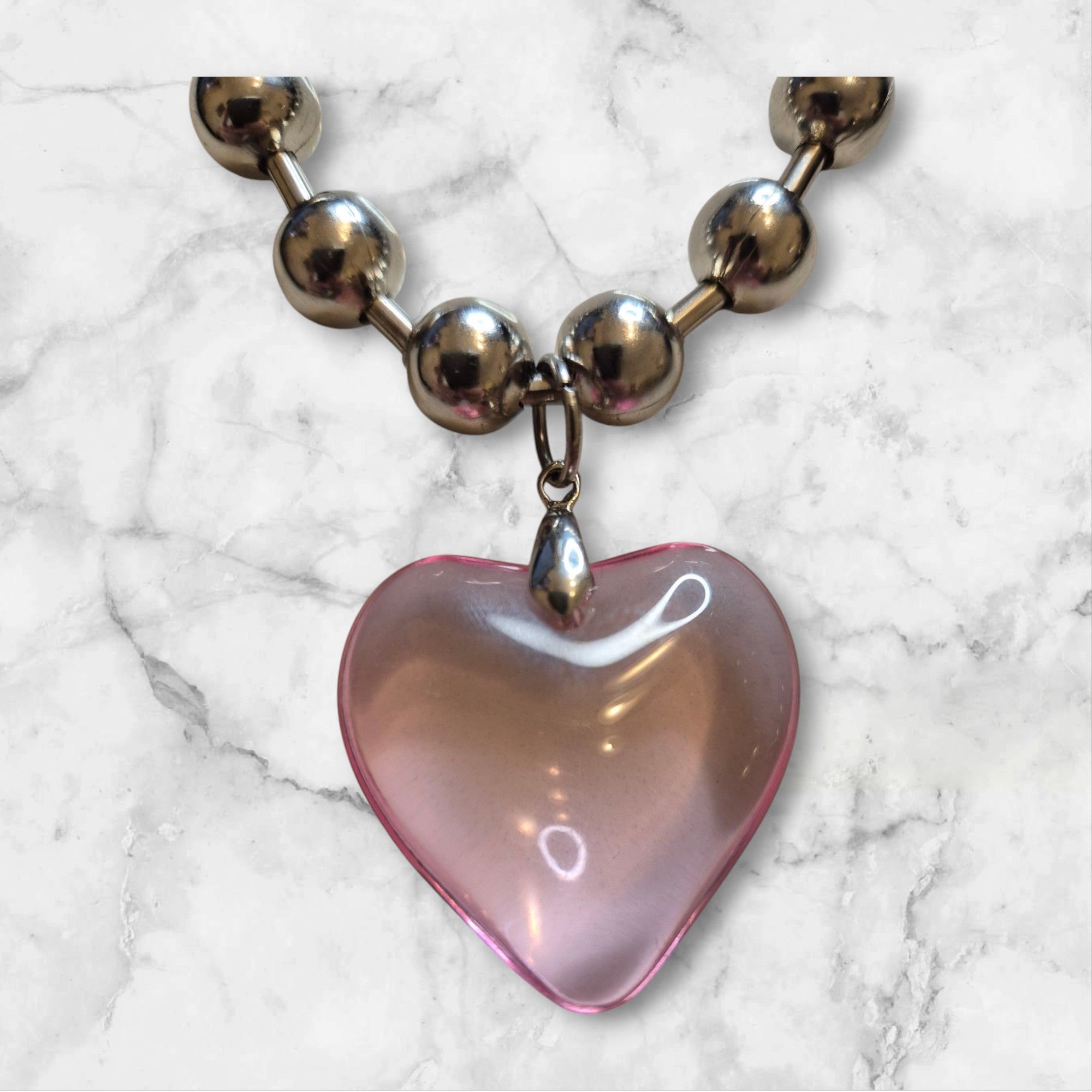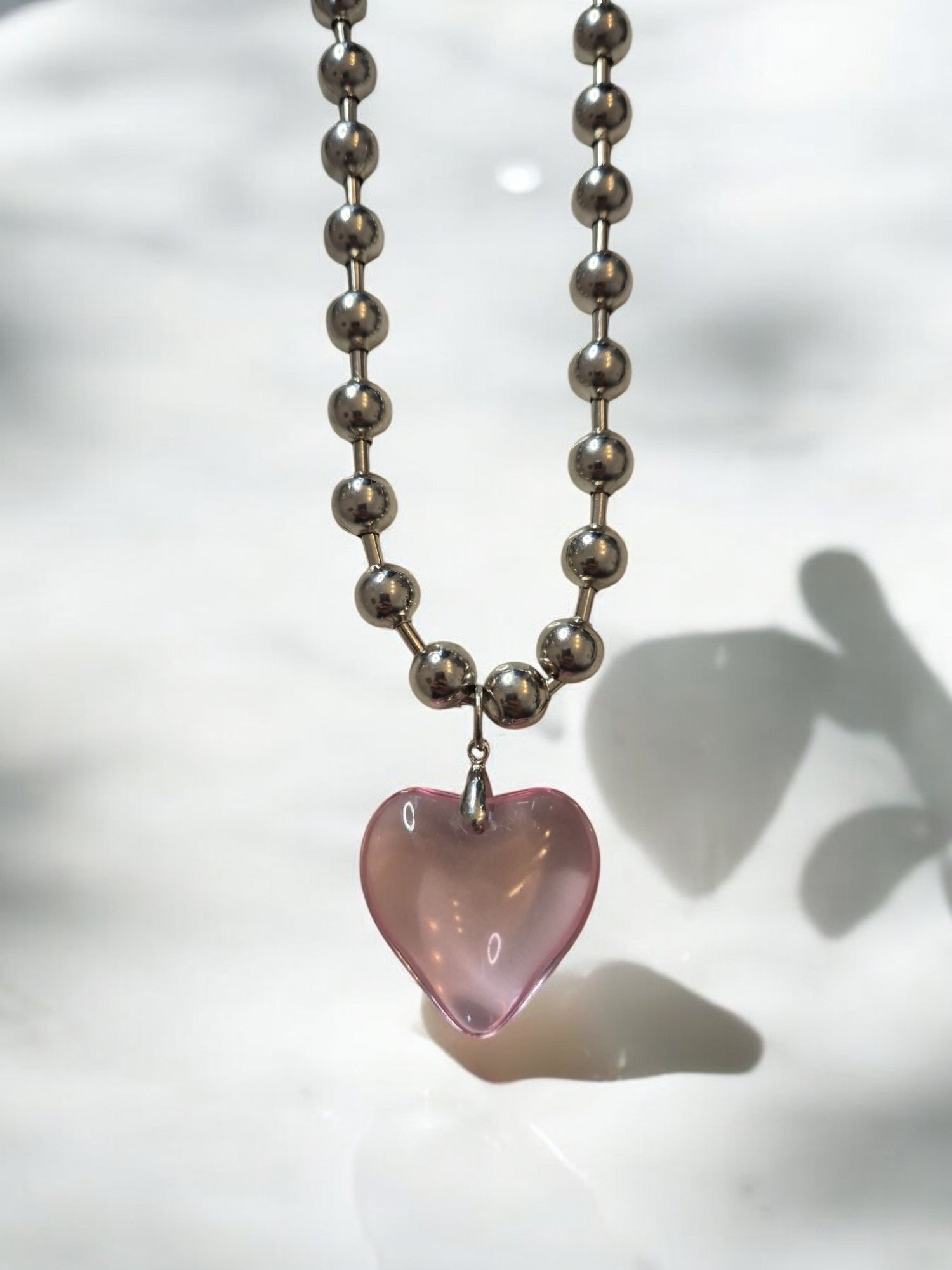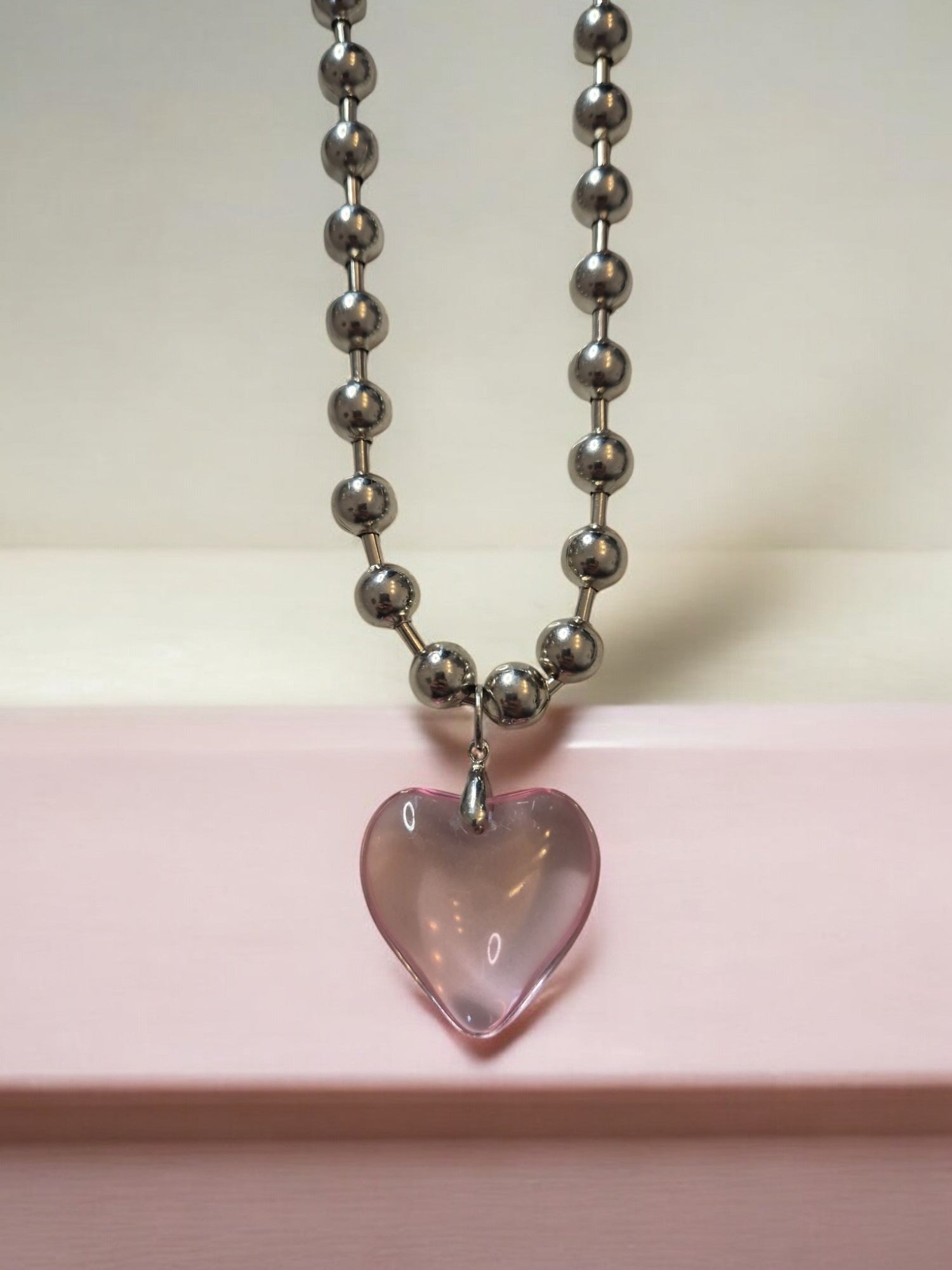 Ce collier audacieux et moderne séduit par son design unique : une chaîne composée de perles argentées lisses et brillantes, rehaussée d’un pendentif cœur en verre rose translucide. Son aspect minimaliste mais tendance en fait un bijou incontournable pour celles qui souhaitent apporter une touche de couleur douce et féminine à leur tenue. Parfait pour un look casual chic ou comme cadeau sentimental, ce collier allie modernité, délicatesse et originalité.