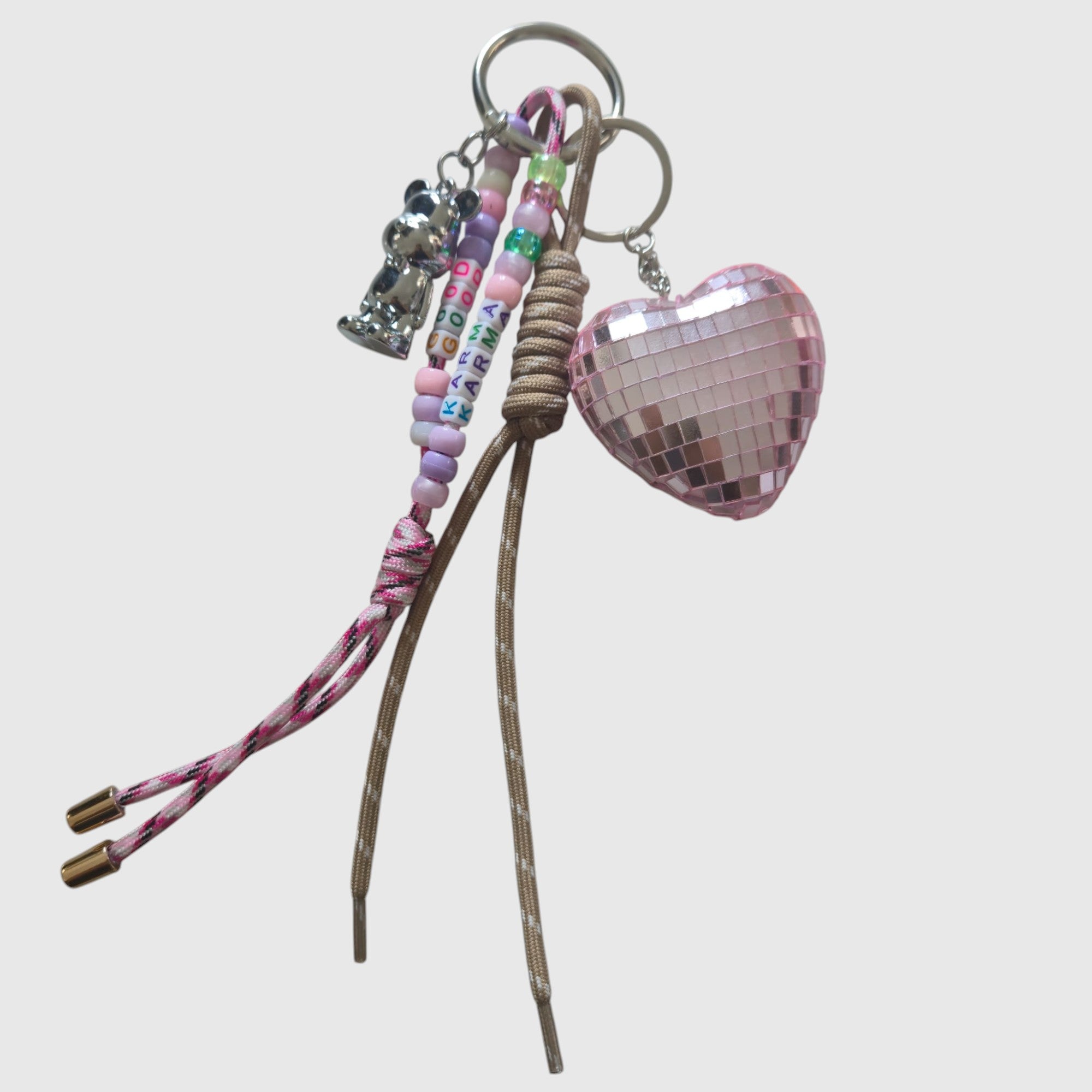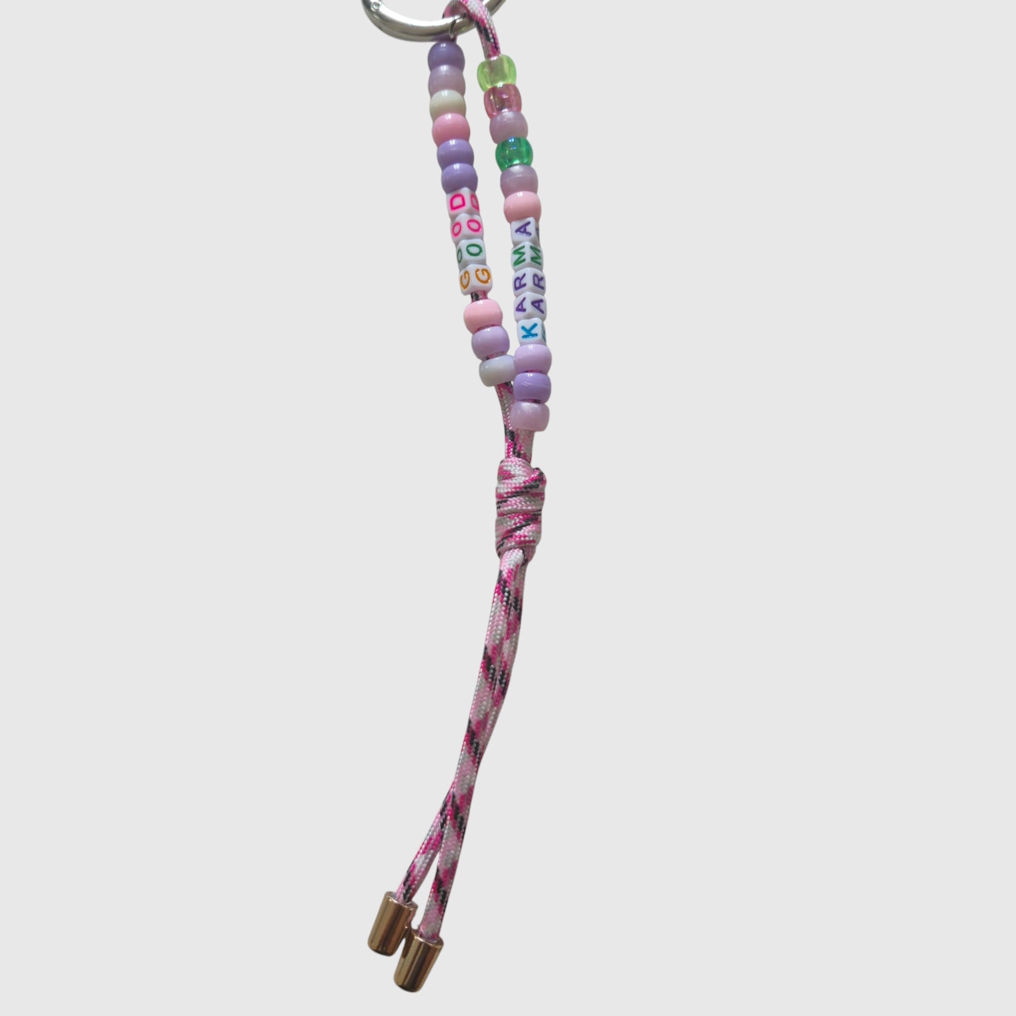 - Perles colorées avec message "GOOD KARMA" : un mantra positif à porter partout.