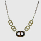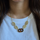 Un collier affirmé qui marie la force graphique des maillons grains de café et la chaleur d’un motif écaille. Sa chaîne dorée à grands maillons encadre un centre sculptural : une alternance de maillons texturés, lisses et ajourés, avec en point d’orgue un grand maillon écaille qui attire la lumière et capte tous les regards.