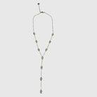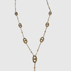 Un sautoir cravate à la fois audacieux et délicat, qui joue sur la verticalité pour allonger la silhouette avec élégance. Sa fine chaîne dorée est rythmée par une succession de maillons grains de café, icônes intemporelles revisitées ici dans une version moderne et lumineuse.