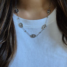 Un collier délicat qui joue l’équilibre parfait entre finesse et caractère. Sa fine chaîne est rythmée par des maillons grains de café — symbole intemporel d’élégance rétro — et de petites perles lisses qui apportent un éclat subtil à l’ensemble.