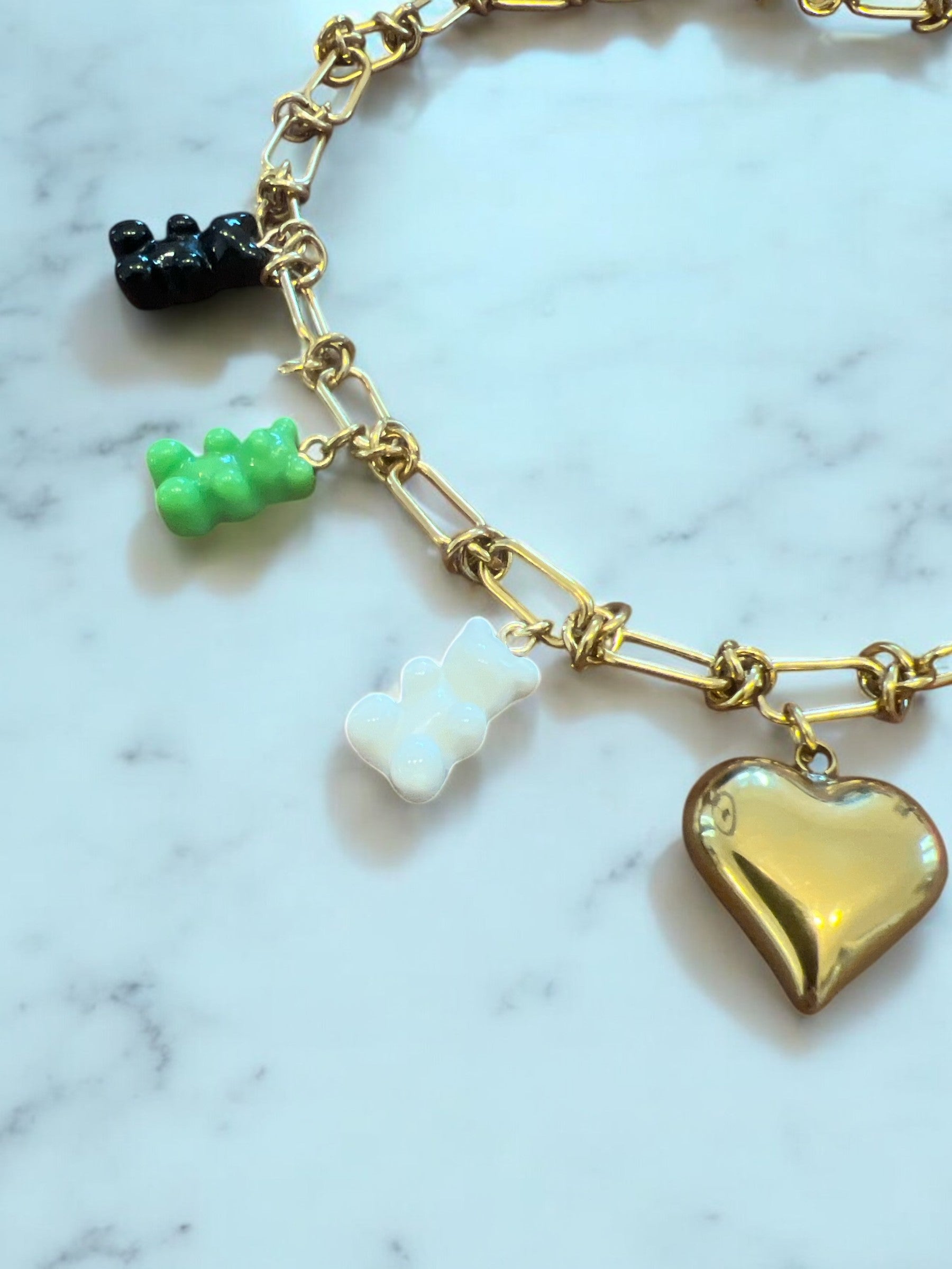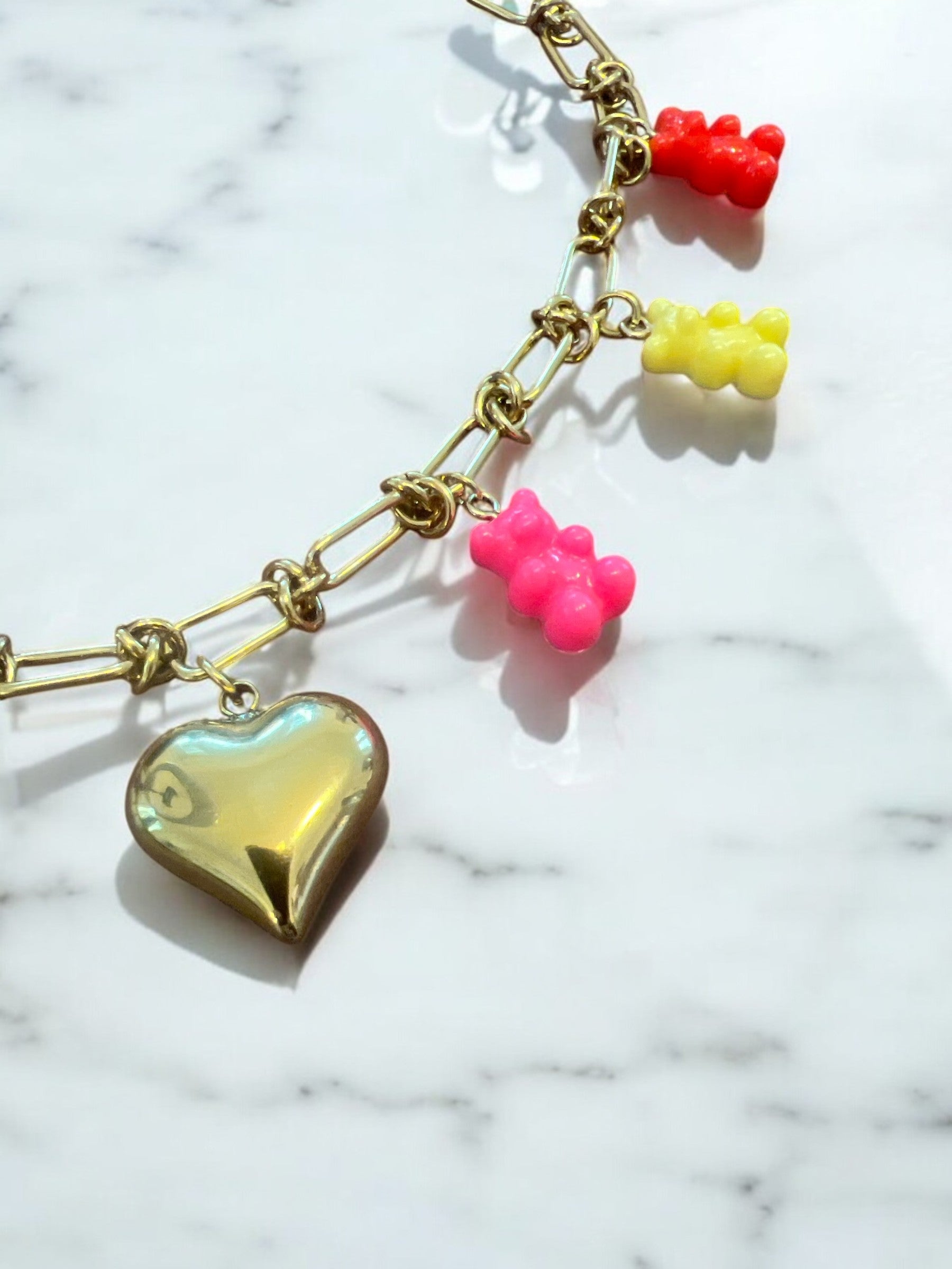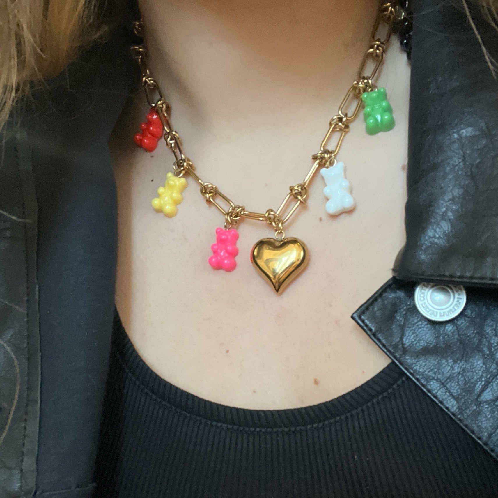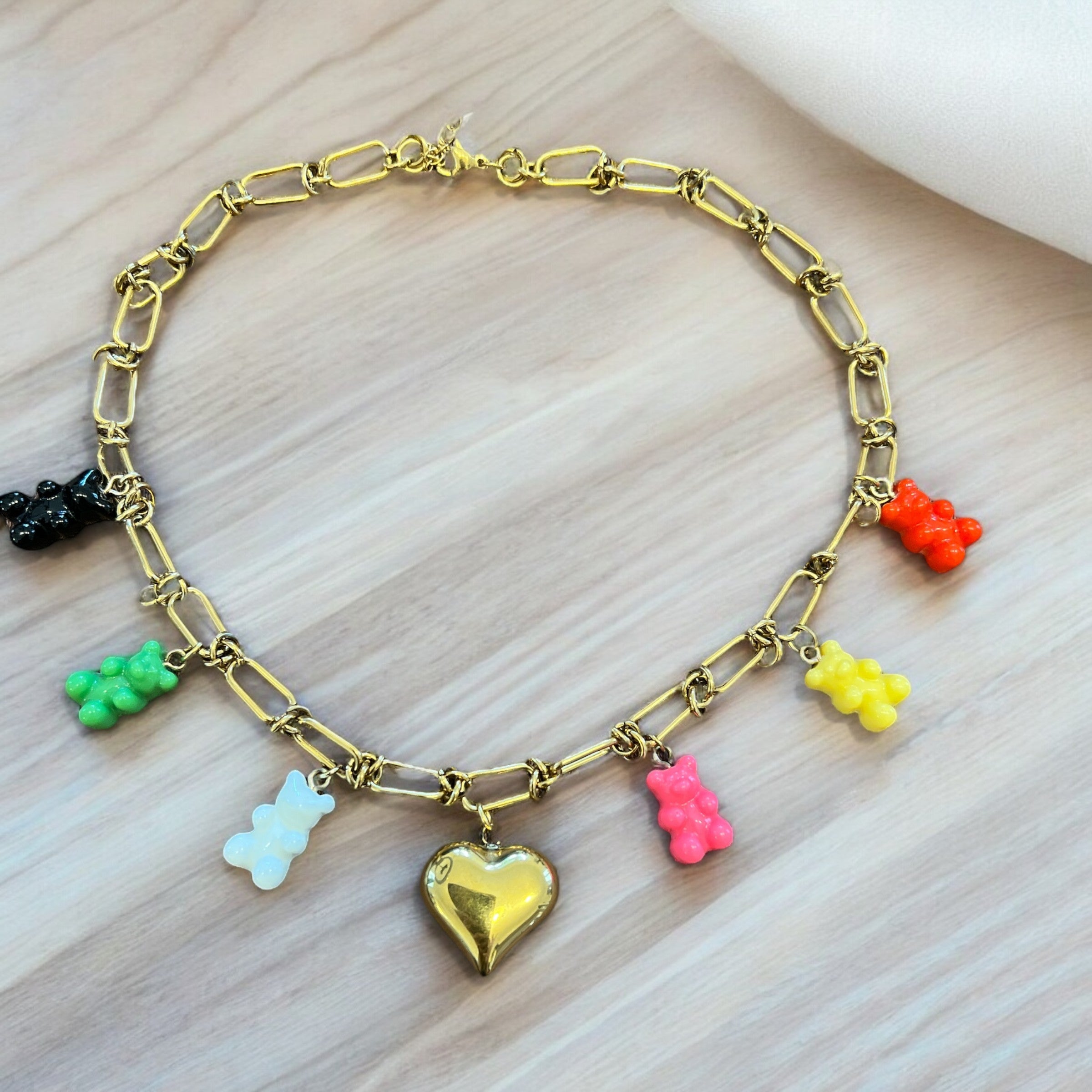 Ajoutez une touche de douceur et de fun à votre look avec ce collier irrésistible, orné de charms colorés en forme d'oursons et d’un cœur doré brillant. Parfait pour apporter une note ludique et réconfortante à vos tenues, ce bijou ne passera pas inaperçu !